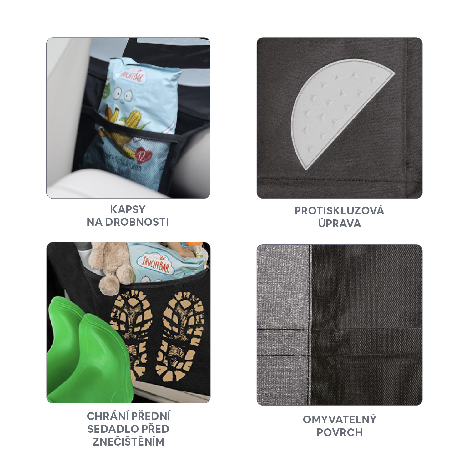 | Dlouhý popis | <h2>Bezpečné a pohodlné cestování</h2> <p><br> STOP klouzání: Už žádné starosti s klouzáním dětských autosedaček! Protiskluzový povrch s texturou zajišťuje, že autosedačka zůstane pevně na svém místě. Záložka na zadní straně poskytuje dodatečnou stabilitu, takže vaše dítě cestuje bezpečně.</p> <h2>Univerzální kompatibilita</h2> <p><br> Nastavitelné bezpečnostní popruhy jsou jako stvořené pro každou opěrku hlavy sedadla. Instalace je rychlá a snadná, a díky univerzální kompatibilitě se tento chránič hodí do většiny automobilů.</p> <h2>3 způsoby použití</h2> <p><br> Flexibilita, kterou ocení každá rodina! Tento chránič autosedačky lze rozdělit na dvě části – jednu můžete použít jako ochranu proti kopání a druhou jako spodní chránič zadního sedadla. Spojením obou částí získáte vysoký chránič, který zajistí maximální ochranu vašich zadních sedadel.</p> <h2>Plná ochrana</h2> <p><br> Váš vůz si zaslouží jen to nejlepší. Náš chránič autosedačky je vyroben z vysoce kvalitního materiálu, který je navržen pro celoživotní použití. Extrémně silný a odolný materiál chrání čalounění vašeho vozu před opotřebením a poškrábáním, zatímco snadno omyvatelný povrch zajišťuje jednoduchou údržbu.</p> <p>Sedadla vaše auta budou s naším chráničem sedadel stále vypadat jako nové, a vy si užijete každý rodinný výlet s vědomím, že vaše děti i sedadla jsou v bezpečí.</p> <p>• Protiskluzový povrch pro bezpečné uchycení <br> • Univerzální kompatibilita s většinou automobilů <br> • Tři různé způsoby použití pro maximální flexibilitu <br> • Vysoce kvalitní a odolný materiál <br> • Snadno omyvatelný pro jednoduchou údržbu <br></p> |