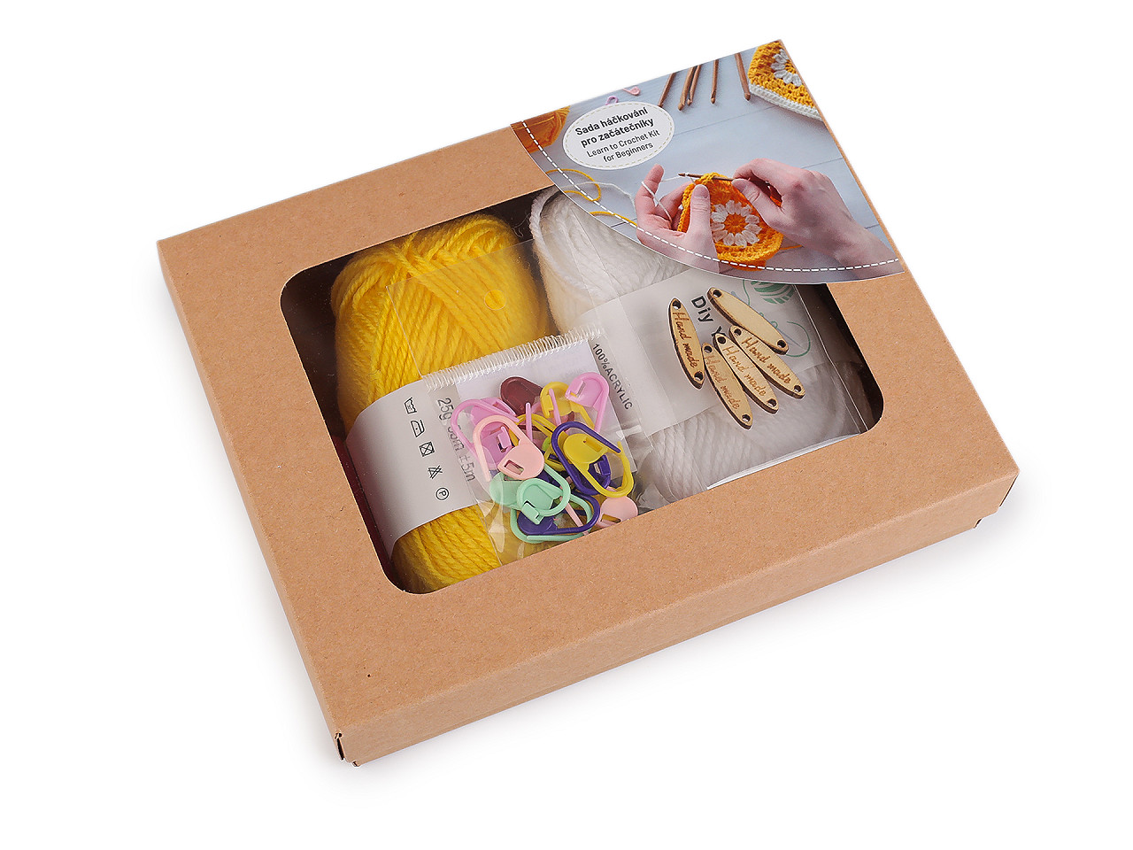 | Krátký popis | Háčkovací sadu ocení všichni začátečníci. V balení najdete 2 háčky ve velikosti 3,5 a 4 mm, plastové jehly (5 ks), plastové spínací špendlíky (20 ks), dřevěné cedulky "Hand made" (5 ks), příze (4 ks) a návod na základy háčkování [v češtině a v angličtině.]<br> Barvy přízí se mohou lišit.<br> <br> [Varianta č. 2 má v balení 2 ks přízí.] | ||||||||