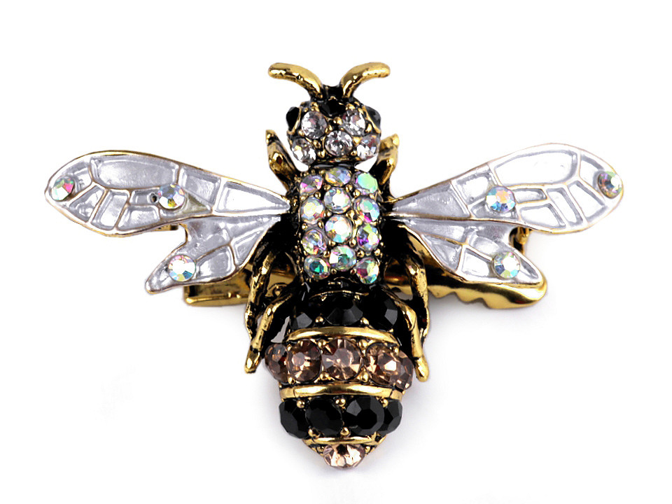 | Krátký popis | Elegantní brož včely působí velice přepychově. Celé tělo je osázené drobnými broušenými kamínky, které se oslnivě třpytí. Kamínky uprostřed mají AB lesk. Na zadní straně je spínací špendlík s pojistkou proti otevření a klips, který využijete k připnutí na klopu saka, tašku apod. Brož můžete nosit nejen na oděvech, ale hodí se i k ozdobení klobouků či sepnutí šátku. Je na plastové kartě, která se dá zavěsit na prodejní stojany. | ||||||||||