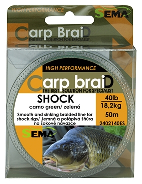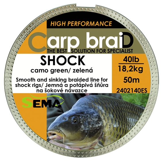 | Dlouhý popis | <p> Shock je velmi jemná, potápivá zelená šňůra na tvorbu šokových návazců. Na kmenový vlasec navažte Shock v délce dvou délek prutu. Docílíte tím pak delších odhozů.</p> <ul> <li> Nosnost: 13,6kg</li> <li> Barva: camo zelená</li> <li> Návin: 50m</li> </ul> |